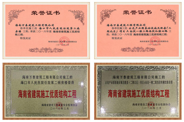 2016年3月,由海南萬(wàn)泰建筑工程有限公司承建的“??谑腥嗣襻t(yī)院住院第二病房樓”及“云龍產(chǎn)業(yè)園基礎(chǔ)設(shè)施及配套(二期)項(xiàng)目”工程被海南省建設(shè)工程質(zhì)量安全檢測(cè)協(xié)會(huì)評(píng)為《海南省建筑施工優(yōu)質(zhì)結(jié)構(gòu)工程》榮譽(yù)稱號(hào)。