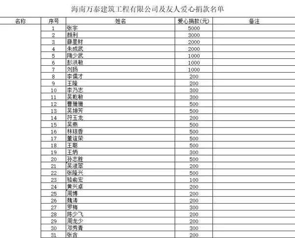 1月28日,我們在海南萬泰建筑公眾號發(fā)布了海南萬泰公司張小龍總經(jīng)理和??谑欣夏耆烁@喉?xiàng)目負(fù)責(zé)人林莉共同出資5萬元購買5000個(gè)N95口罩及飛利浦G31E病人監(jiān)護(hù)儀1套捐贈給武穴市及張小龍總經(jīng)理組織同胞募捐的文章《心系荊楚,共渡難關(guān),這場戰(zhàn)“疫”,海南萬泰在行動!》,在公司引起了極大反響,大家主動問詢?nèi)绾尉杩顬楹币咔楸M一份力,大家的一腔熱血和愛心令人動容,由此,我們迅速成立萬泰籌募組,在公司內(nèi)部展開了愛心捐款。愛心捐款行動一呼百應(yīng),在短短不到兩天的時(shí)間里,萬泰募捐組就收到了來自公司員工,萬泰各地項(xiàng)目部及公司的合作友人的支持。截止目前,萬泰籌募組已籌得284380元的善款!這些善款,我們已全部捐贈給武穴市梅川鎮(zhèn)政府用于抗擊湖北疫情。捐款情況已向海南省湖北商會,武穴市工商聯(lián),武穴市統(tǒng)戰(zhàn)部匯報(bào)。后續(xù)我們將跟蹤款項(xiàng)用途。