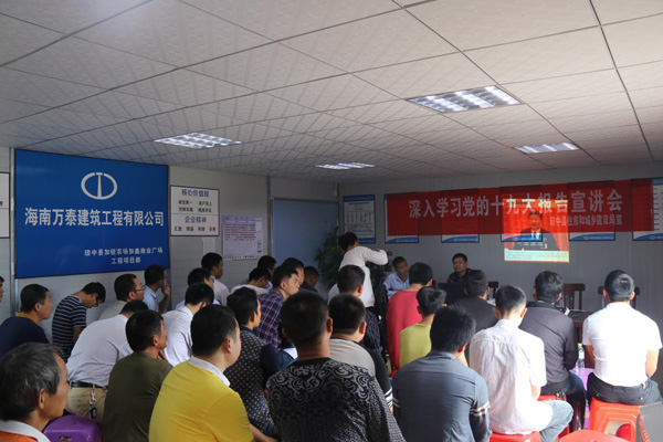 為深入貫徹落實十九大精神,將十九大精神全面、系統(tǒng)的傳達給一線工人,按照公司的總體要求和部署,繼11月25日成功舉行第一次十九大精神宣講會后,海南萬泰計劃將在各項目部以豐富多樣的形式貫徹落實十九大精神。11月30日,由瓊中縣住建局相關(guān)領(lǐng)導組成的宣講團到海南萬泰承建的瓊中縣加釵農(nóng)場加鑫商業(yè)廣場項目開展十九大精神宣講會。項目部全體工人、瓊中縣各工程建設(shè)項目代表參加了宣講會。