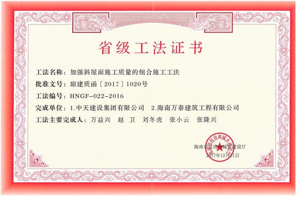 2017年12月5日,海南省住房和城鄉(xiāng)建設(shè)廳發(fā)布公告,公布了2016年度海南省省級工法名單。海南萬泰建筑工程有限公司申報的兩項工法(定型化電梯井操作平臺提升架施工工法、加強(qiáng)斜屋面施工質(zhì)量的組合施工工法)名列榜單,且得票數(shù)均為13票,得票率百分之百。