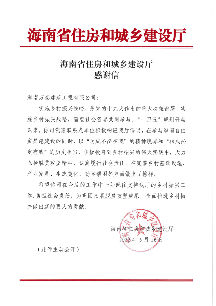 盛夏六月,喜事連連。在海南萬泰建筑工程有限公司成立十一周年之際,公司喜獲海南省住房和城鄉(xiāng)建設廳的感謝信,信中表彰了萬泰公司響應省住建廳倡議,積極投身到鄉(xiāng)村振興事業(yè),大力弘揚脫貧攻堅精神,認真履行社會責任,在完善鄉(xiāng)村基礎設施、產(chǎn)業(yè)發(fā)展、生態(tài)美化、助學幫困等方面做出了榜樣。