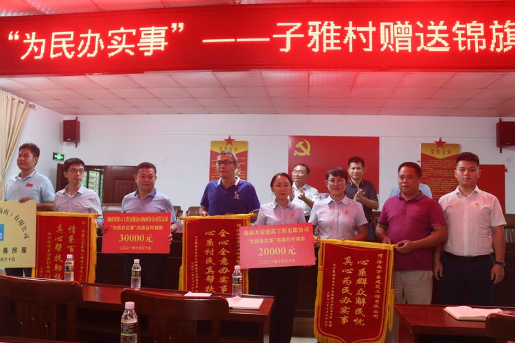 海南萬泰建筑工程有限公司自成立以來就堅定不移聽黨話、感黨恩、跟黨走,通過開展黨課、為民辦實事、主題教育活動等形式,學以正心、學以致用、學以創(chuàng)新。近些年,在省住建廳的指導和幫助下,在企業(yè)不斷發(fā)展壯大的同時,不忘承擔社會責任,積極響應省廳關于鄉(xiāng)村振興、鞏固脫貧攻堅等公益民生事業(yè)的號召,慷慨解囊,為民辦實事,為白沙縣爾信村、高石村、打安村等多個幫扶村捐款捐物,修筑了民心漫水橋、便民路、村民文化廣場路燈及牛棚改造等項目,以一己綿薄奉獻之力,倡導社會和諧大愛。
