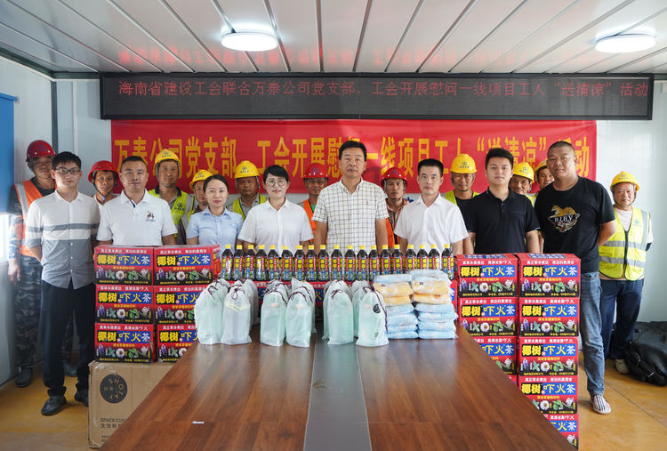 為深入貫徹落實(shí)習(xí)近平新時(shí)代中國特色社會主義思想,切實(shí)做好高溫天氣防暑降溫工作,保障一線項(xiàng)目工人的身體健康,確保安全文明施工,9月5日,在省建設(shè)工會的關(guān)心和支持下,海南萬泰建筑工程有限公司到公司承建的瓊海金輝雅苑、永成·和悅府項(xiàng)目部開展了慰問一線項(xiàng)目工人“送清涼”活動。公司黨支部、工會、總經(jīng)辦、工程部以及項(xiàng)目負(fù)責(zé)人、一線工人等參加本次活動。