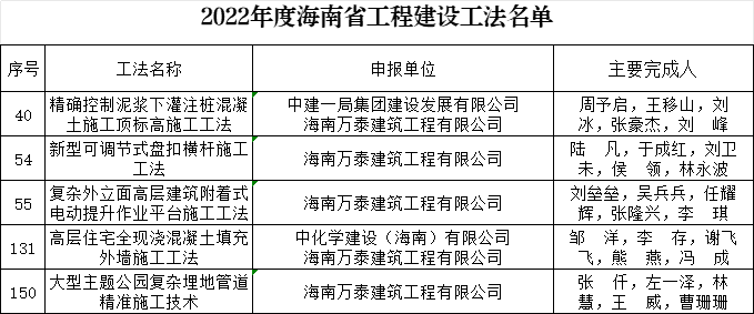 近日,由海南萬泰建筑工程有限公司申報的《大型主體公園復雜埋地管道精準施工技術》《復雜外立面高層建筑附著式電動提升作業(yè)平臺施工工法》《高層住宅全現(xiàn)澆混凝土填充外墻施工工法》《精確控制泥漿下灌注樁混凝土施工頂標高施工工法》《新型可調(diào)節(jié)式盤扣橫桿施工工法》共5項省級工法通過省住建廳評審,并頒發(fā)了相應省級工法證書。據(jù)悉,這5項省級工法是公司的個別工程項目經(jīng)過實踐總結(jié)出來的技術成果,具有良好的安全性、經(jīng)濟性和適用性,可提高工效、縮短工期、大幅降低工程成本。此次通過的省級工法,是萬泰在工程施工技術方面的重大創(chuàng)新,后續(xù)我司將廣泛推廣至各工程項目中加以應用。