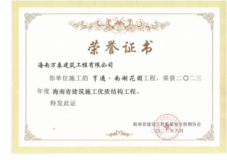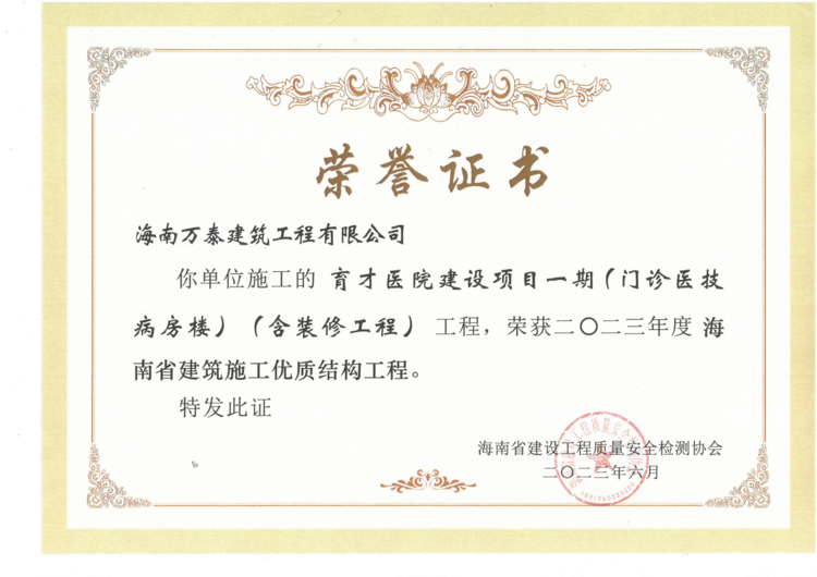 近日,由公司承建的育才醫(yī)院建設項目一期、保亭黎族苗族自治縣人民法院審判法庭建設項目、亨通·南湖花園分別通過了海南省建設工程質(zhì)量安全檢測協(xié)會的評審,被評為“2023年度海南省建筑施工優(yōu)質(zhì)結(jié)構工程”。該獎項代表著全省建筑工程結(jié)構施工質(zhì)量的領先水平,是精品工程的重要標志。