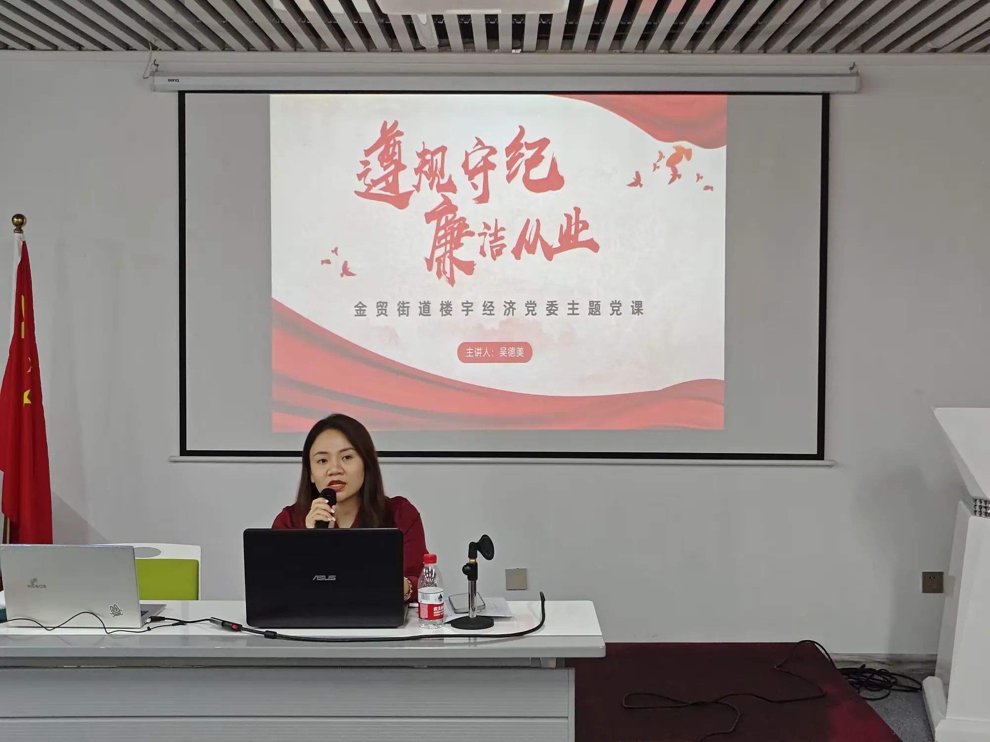 活動(dòng)中,金貿(mào)街道樓宇經(jīng)濟(jì)黨委書記吳德美以“遵規(guī)守紀(jì) 廉潔從業(yè)”為主題為大家講授了一堂深刻的黨課,從廉潔從業(yè)的有關(guān)規(guī)定、意義、企業(yè)關(guān)鍵崗位廉潔風(fēng)險(xiǎn)點(diǎn)及防控措施、警示案例等多方面強(qiáng)調(diào)了廉潔從業(yè)的重要性。