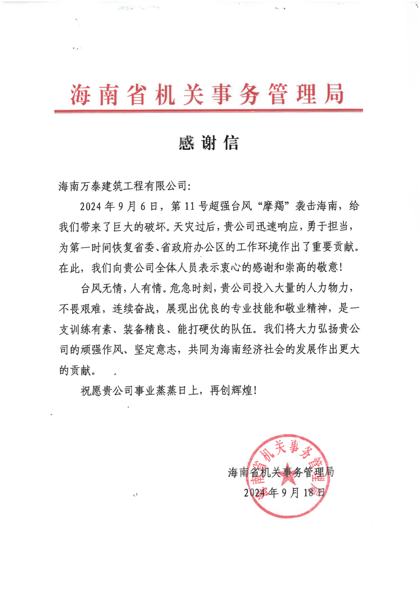 近日,海南萬(wàn)泰建筑工程有限公司收到一封來(lái)自海南省機(jī)關(guān)事務(wù)管理局的感謝信。信中感謝了海南萬(wàn)泰公司在臺(tái)風(fēng)剛過(guò)后,迅速響應(yīng),勇于擔(dān)當(dāng),組織力量投入超強(qiáng)臺(tái)風(fēng)“摩羯”災(zāi)后的道路清障工作,為第一時(shí)間恢復(fù)省委、省政府辦公區(qū)的工作環(huán)境作出了重要貢獻(xiàn)。
