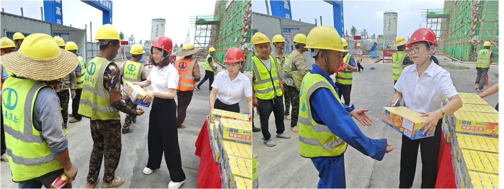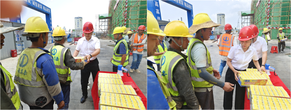 在活動中,顏利首選了解了項(xiàng)目的建設(shè)情況以及工人作業(yè)安全保障工作,叮囑工友們要注意提高防范意識,勞逸結(jié)合,做好夏日防暑工作,保護(hù)好自身安全,以更飽滿的熱情和昂揚(yáng)的斗志,投入到工作中去,為項(xiàng)目早日竣工貢獻(xiàn)力量。隨后,大家共同為工友們送去了下火茶、綠豆、消暑藥品等清涼物資以及節(jié)日祝福。