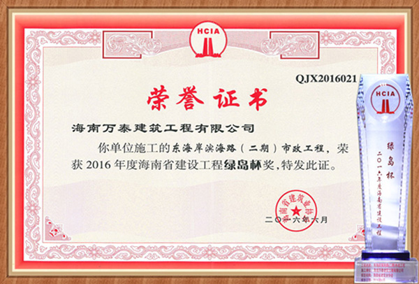 2016年6月13日,由海南萬泰承建的東海岸濱海路(二期)市政工程順利通過公示,喜獲海南省建設工程“綠島杯”獎項。