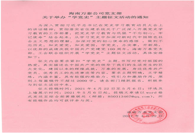 自4月22日起,海南萬泰黨支部、工會聯(lián)合開展“學黨史”主題征文活動?;顒油ㄖl(fā)布后,廣大黨員、職工踴躍報名、積極投稿,參加了此次活動。